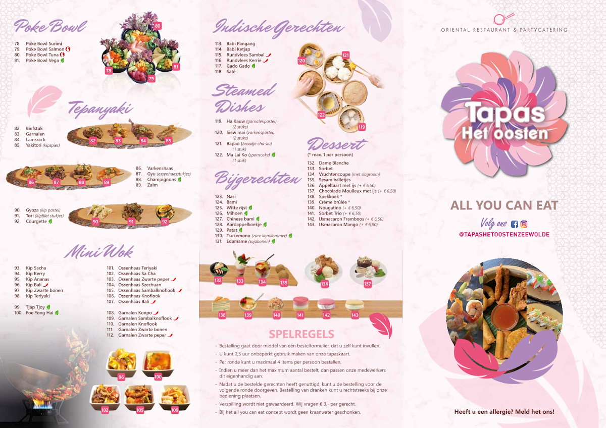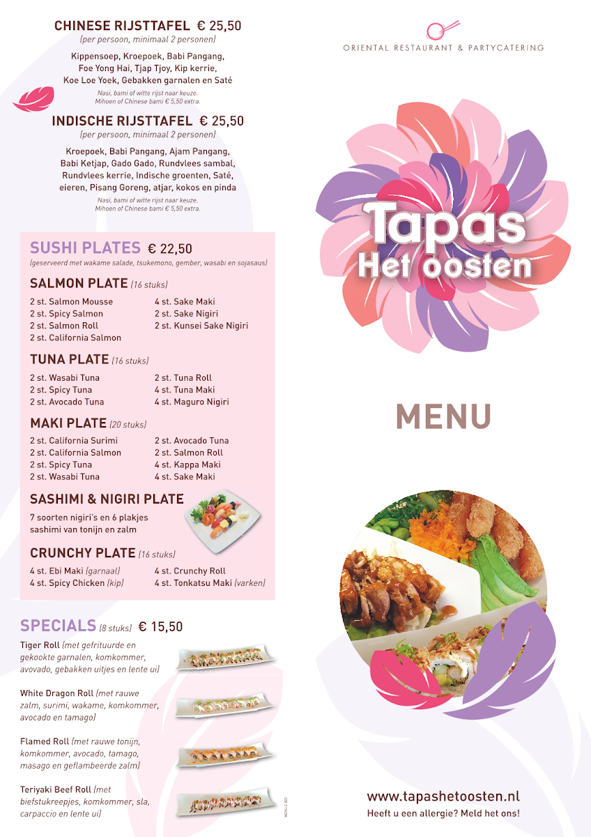 Welcome to Tapas het Oosten, a delightful culinary gem located at Flevoplein 1 in Zeewolde, Netherlands. This vibrant restaurant perfectly blends the flavors of sushi and diverse small Chinese dishes, making it an ideal spot for both shared meals and individual cravings. Reviewers consistently rave about the friendly atmosphere and affordable pricing, often remarking that it offers great value compared to other eateries in the area.
